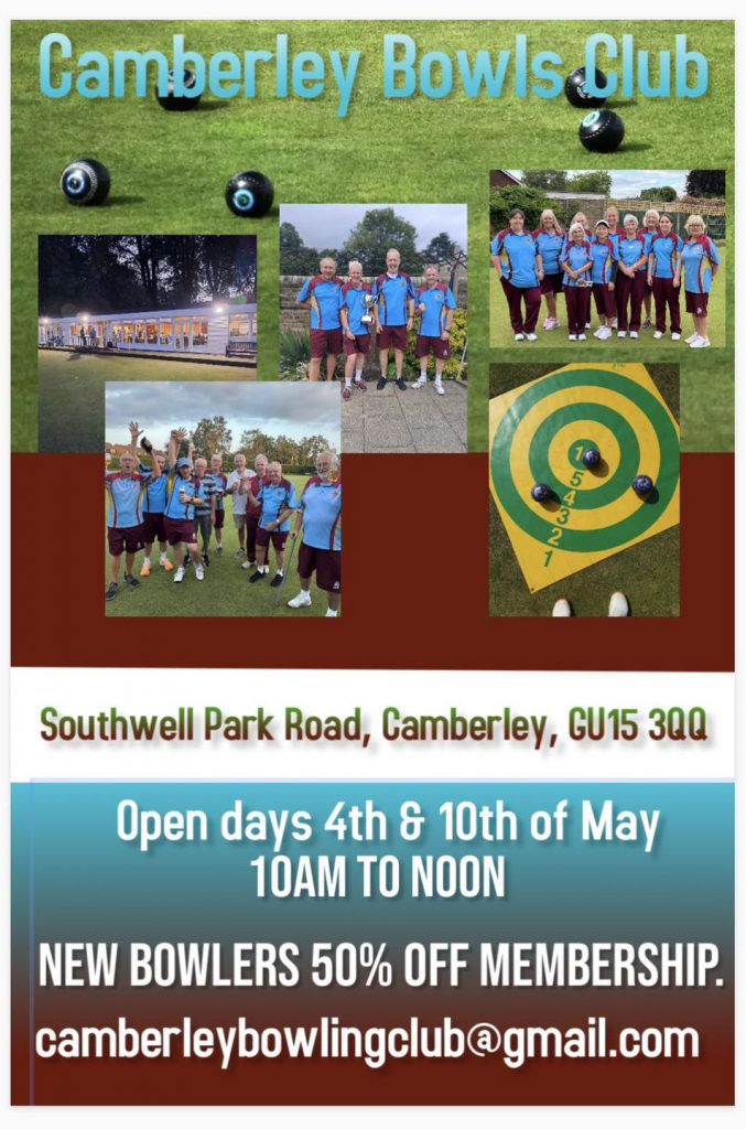 Open Days for the coming season are on the 4th and 10th of May. 10am to 12pm. Everyone is very welcome from complete beginners to experienced bowlers, just wear trainers or flat shoes. Please email us atcamberleybowlingclub@gmail.com if you have any questions or would like to book a set day & time. We look forward to seeing you there.